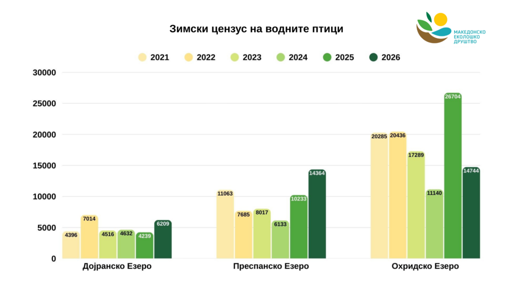 Над 35.300 единки од 44 различни видови водни птици беа попишани за време на зимското пребројување на птици на трите природни езера во Македонија, што под водство на Македонското еколошко друштво кај нас се случува секој јануари од 2010 година наваму како дел од Меѓународниот зимски цензус на водни птици.