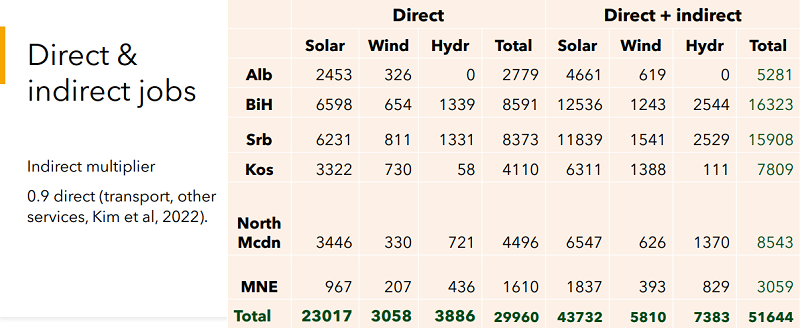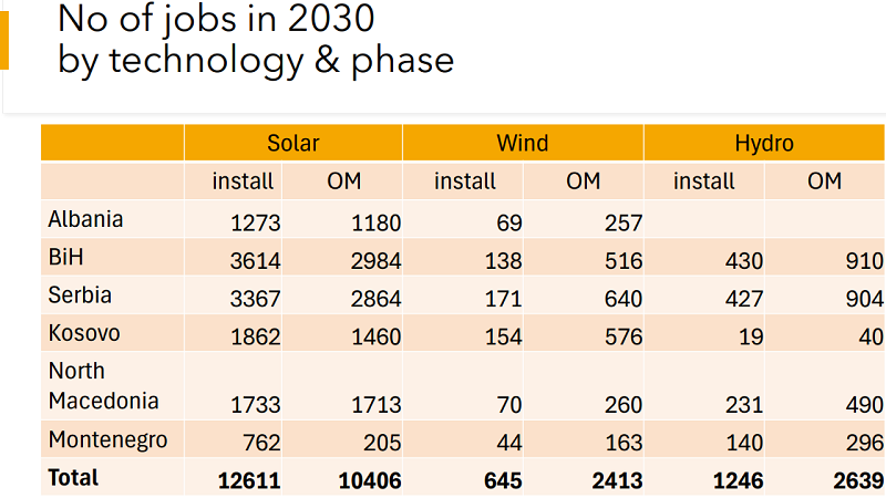 Што се однесува до Македонија, процените се дека секторот обновливи извори на енергија во наредните седум години би можел да креира повеќе од 4.100 нови работни места. Најголемиот број би биле во делот на соларна енергија (во Македонија 2.998, а во сите земји на Западен Балкан 18.878), а нешто помалку во областа на хидро енергијата (во Македонија 680) и искористувањето на ветерот (во Македонија 484).