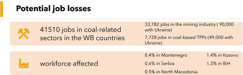 „Првите груби процени се дека ќе се изгубат работни места кои што се базираат на јагленот, а ќе добиеме повеќе работни места во секторот на обновливи извори на енергија (РЕС)“, вели Боромиса, додавајќи дека потенцијална загуба е 41.510 работни места во секторите поврзани со јаглен во земјите од Западен Балкан, од што 33.700 работни места се во рударството, а 7.728 работни места во термоелектраните.