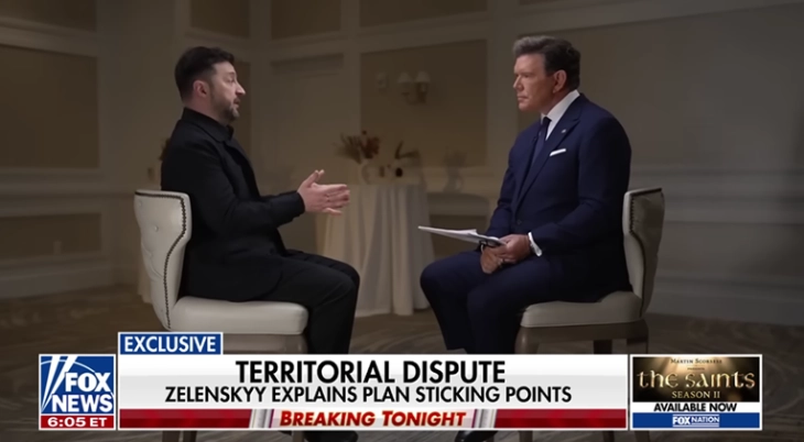 Украинскиот претседател Володимир Зеленски изјави дека Украина, како дел од кој било мировен договор со Русија, не може едноставно да се повлече од своите територии, нагласувајќи дека ова прашање оди подалеку од законската рамка и директно влијае на животите на луѓето. Тој го кажа ова во интервју со новинарот Брет Бајер за Фокс њуз.