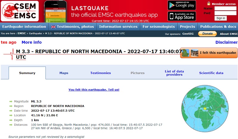 Според Сеизмолошка опсерваторија при Природно-математичкиот факултет во Скопје, земјотресот со интензитет од III-IV степени според Европската макросеизмичка скала се случи во 15:40 часот.