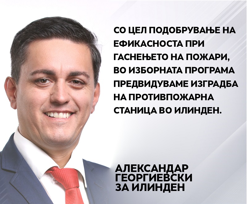 Безбедноста на живеењето на жителите на Општина Илинден, како за нивната безбедност, така и за безбедноста на нивните добра и имоти е еден од врвните приоритети во програмата на кандидатот за градоначалник на ВМРО-ДПМНЕ и коалицијата „Обнова на Македонија“ за Општина Илинден, Александар Георгиевски.