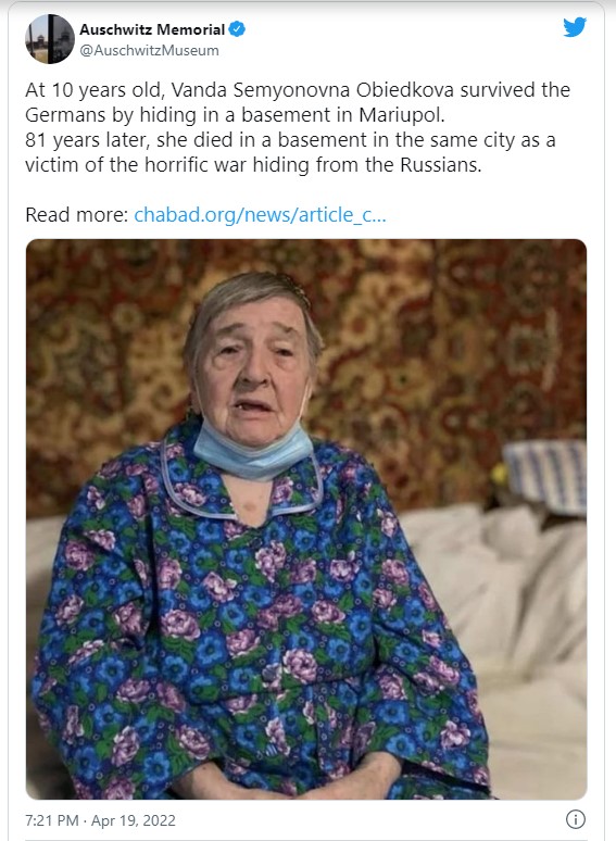 Преживеанa од hолокаустот загина додека се криелa од руските сили во опколениот град Мариупол, пишува еврејската веб-страница Chabad.org.