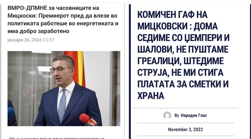 Денес, Мицкоски не само што се оддалечи од граѓаните – тој отворено им се потсмева. Се повикуваше на сиромаштија кога тоа му носеше политички поени, а денес се крие зад приказна за „добро заработени пари“ кога треба да објасни луксуз што не може да го оправда.