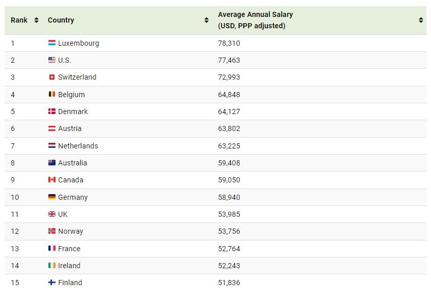 Од овој сет на податоци, може да се види дека Луксембург, САД и Швајцарија нудат највисоки просечни годишни плати.