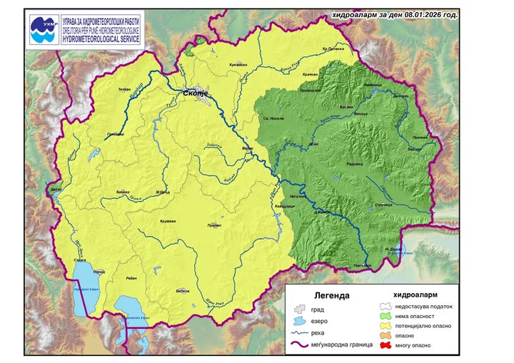 За денеска, Управа за хидрометеоролошки работи (УХМР) објави „Жолто ниво“ за предупредување од поплави, односно постои потенцијална опасност од локално излевање на реките и суводолиците.