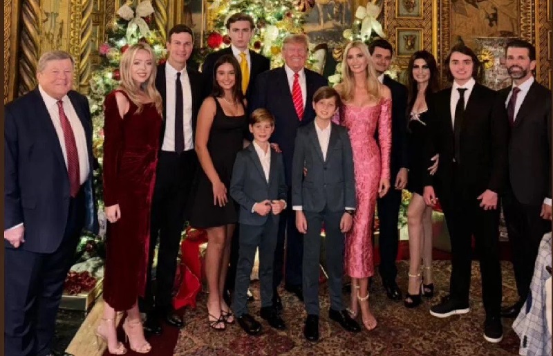 На божикната фотографија позираат Кимберли Гилфојл, свршеницата на Доналд Трамп Помладиот, самиот поранешен претседател Доналд Трамп; Иванка Трамп, нејзиниот сопруг Џаред Кушнер и нивните деца; Тифани Трамп и нејзиниот сопруг Мајкл Булос; и Барон Трамп, синот на Меланија.