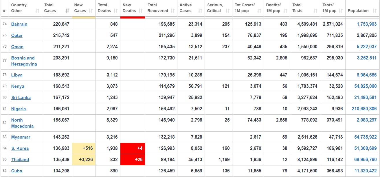 Точно е дека Македонија е на четвртото место во светот по бројот на починати (зад Унгарија, Босна и Херцеговина и Чешка), а на шесто ако се земат предвид и Сан Марино и Гибралтар, но зошто партијата потоа веднаш поминува од другата страна на вистината – кон лагата и пишува дека во Македонија има „повеќе од 10 илјади починати“. Па таа лага уште да се стави и во насловот на соопштението. Еве ја денешната табела на Ворлдметар. Таму не пишува дека во Македонија има 10.000 починати од короната.